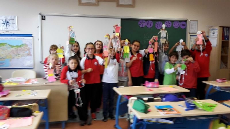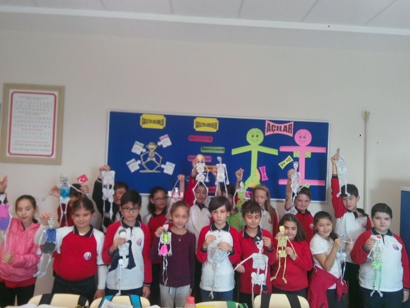 Okulumuzun 4-A, 4-B, 4-C ve 4-D sınıfı öğrencileri "Vücudumuz Bilmecesini Çözelim" ünitesini işlerken iskeletin bölümlerini daha iyi öğrenmek için sınıf içi etkinliğinde iskelet şekli oluşturup bu şekli süsleyerek hem eğlendiler hem de konuyu daha iyi öğrendiler.