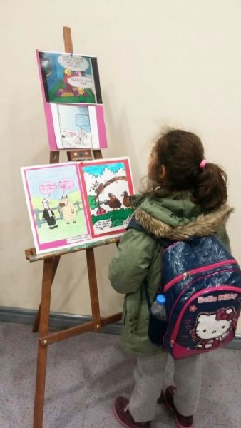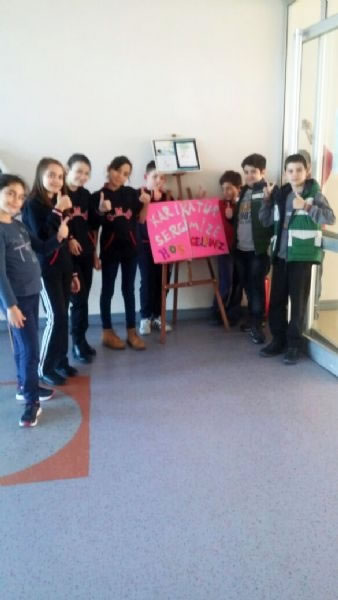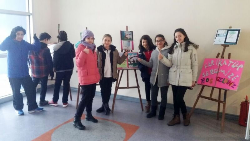 Türkçe dersinde öğrendiğimiz yazma, okuma, anlama ve düşüncelerimizi ifade etme yöntemlerini; söz sanatlarını, mecazları, deyimleri ya da atasözlerini kısacası tüm söz oyunlarını ve kelime haznelerini kullanmaya imkân veren eğlenceli bir alana, karikatür çizmeye aktarmaya çalıştık. Mizah ile çizimi buluşturmayı seven öğrencilerimiz farklı konularda karikatürler çizdiler ve bu karikatürlerimizi okulumuzun giriş katında sergiledik.