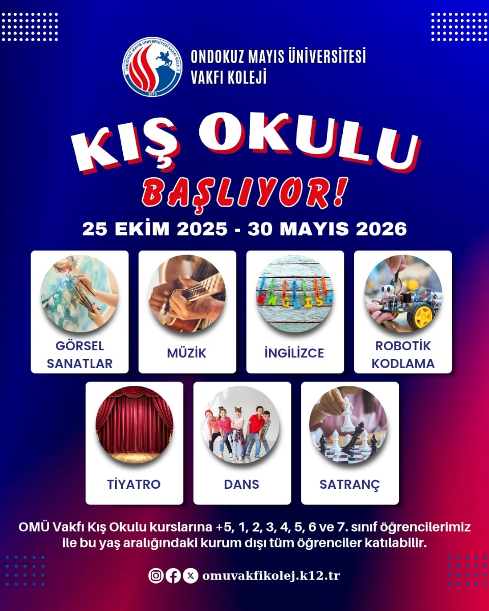Kış Okulumuzda; müzik, robotik kodlama, satranç, görsel sanatlar, dans, tiyatro ve İngilizce branşlarında açılacak kurs programları; OMÜ Vakfı Koleji'nin yetkin eğitim kadrosu tarafından verilecektir.