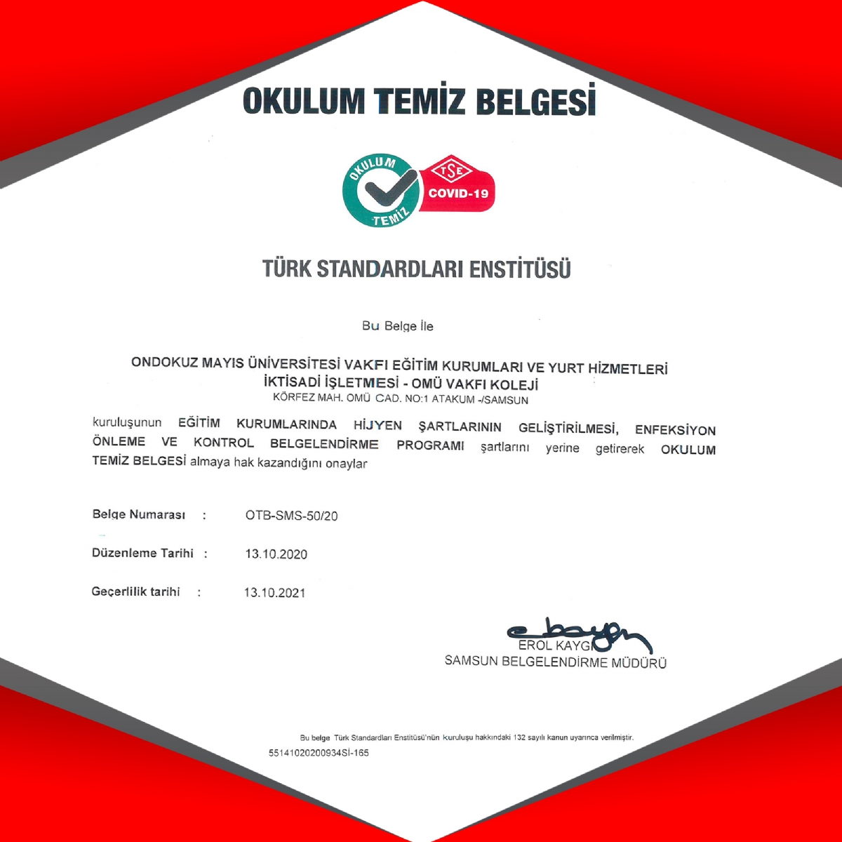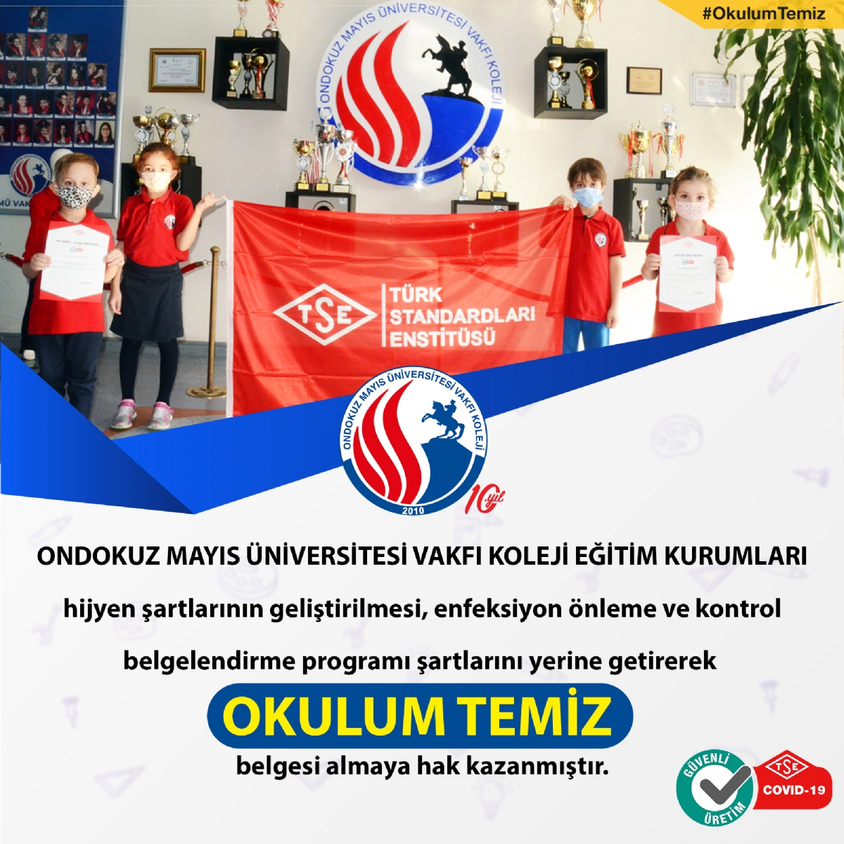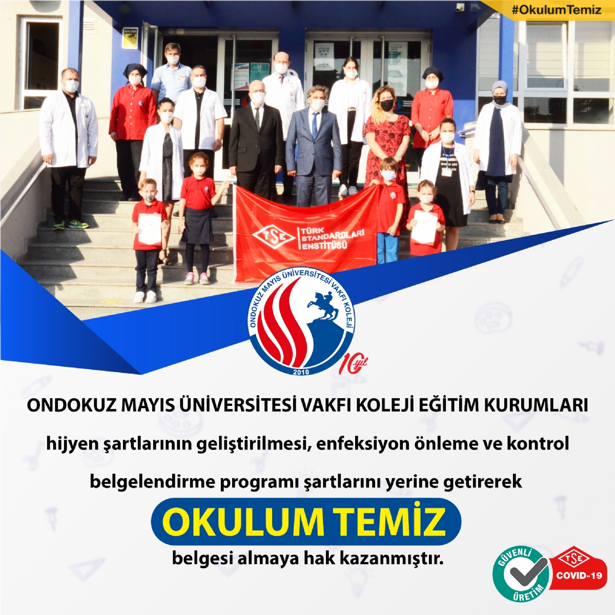Ondokuz Mayıs Üniversitersi Vakfı Koleji hijyen şartlarının geliştirilmesi, enfeksiyon önleme ve kontrol belgelendirme programı şartlarını yerine getirerek OKULUM TEMİZ BELGESİ almaya hak kazanmıştır.